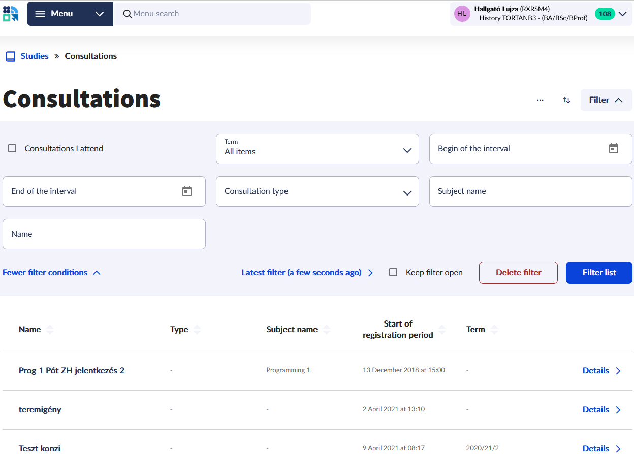 The list of consultations can be narrowed down to semester, registration interval, type, name/code of subject, name of consultation. The details of the consultation is available and registration can be performed by clicking the Details link.