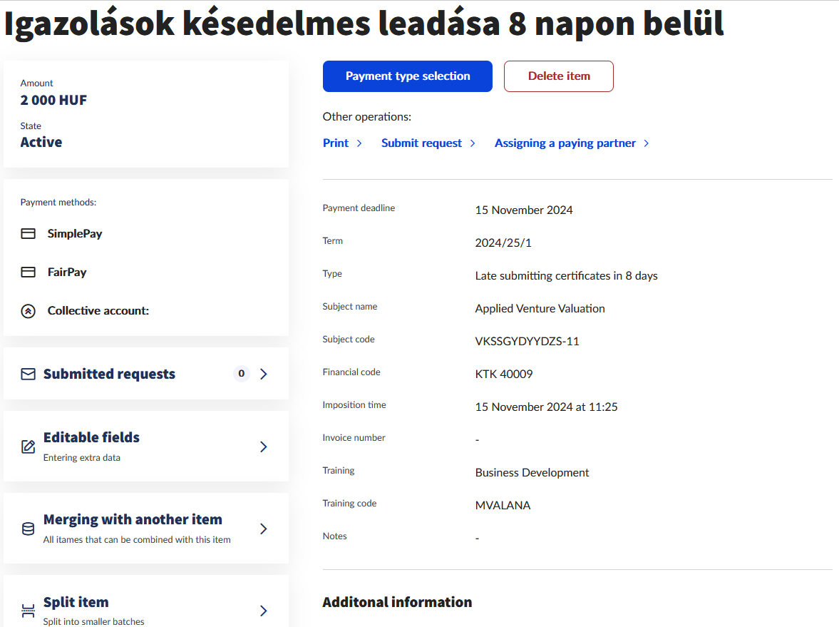 Opening the screen, the detailed data of the item are displayed, and functions related to the item to be paid become also available: Print, Signing up with a student loan, Submit request, Assigning a paying partner, Merge, Disjoining and maybe the Editable fields.