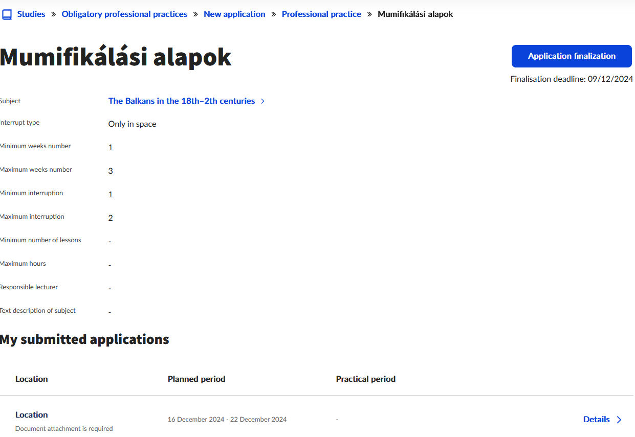 Once the registration for the required field practice locations took place, the registrations must still be finalized. This can be performed by clicking the Finalize applications button in the 'Outer field practice locations' popup window.