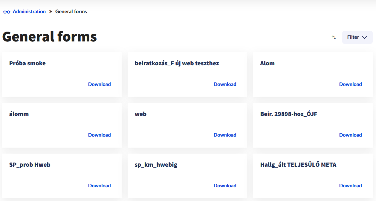 After logging in, the General forms menu item can be found under the Administration menu item of the Menu. These forms are not linked to other menu items, they can be downloaded and printed independently from other menu items and functions.