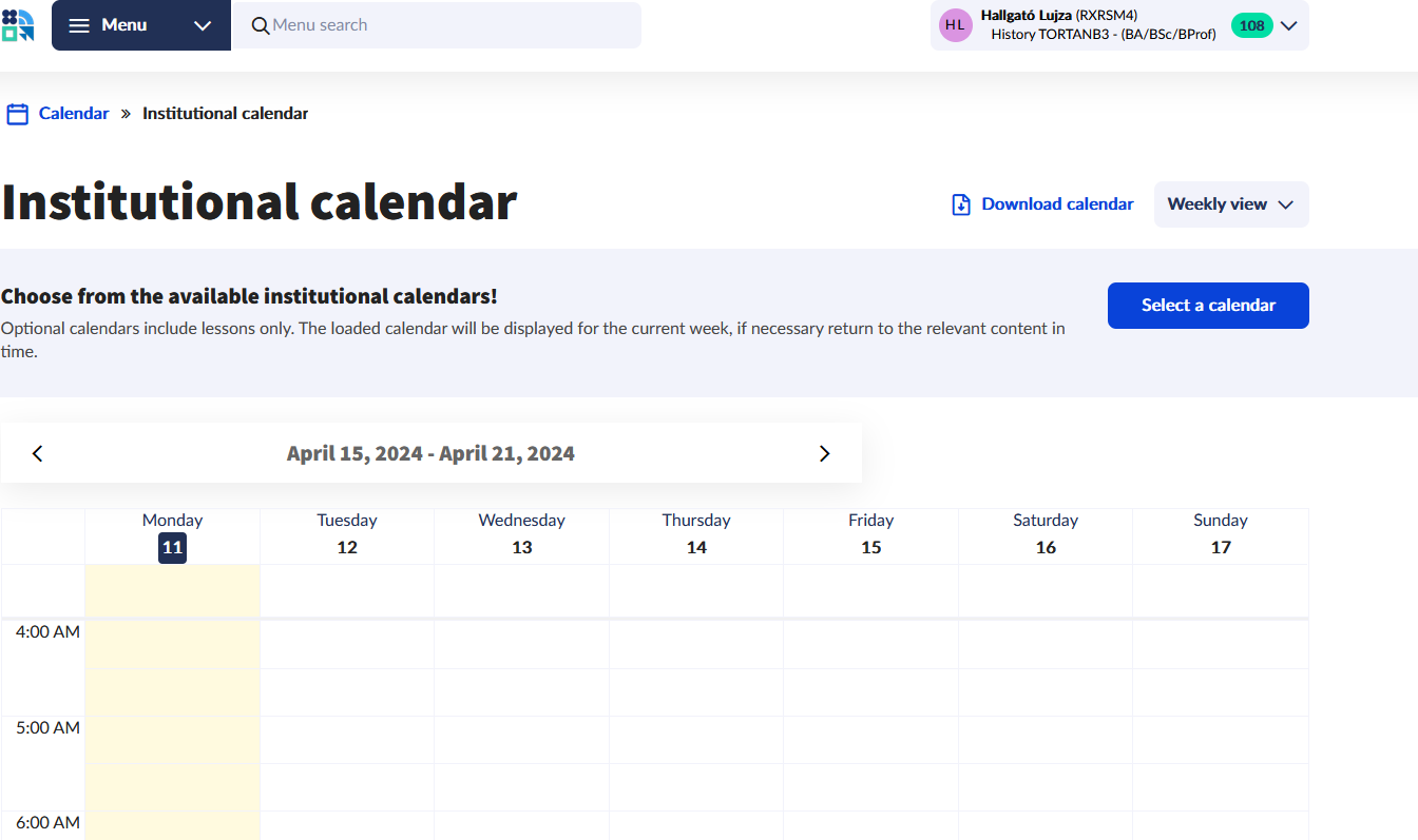 The class schedules the institute announces can be viewed on the institutional calendar screen. Depending on institutional routine, they may be the class schedules of certain trainings, majors, faculties. The institutional calendar is independent from the courses taken by the student, and only scheduled classes are displayed in it.