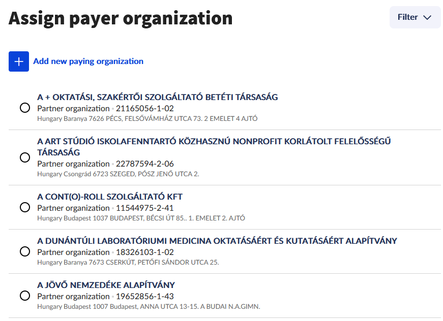 Only previously recorded paying partner or organisation can be assigned to items. If the student has failed to do it, he or she can do so during the process here, or on the Finances/Data and settings/Paying partner menu items too.