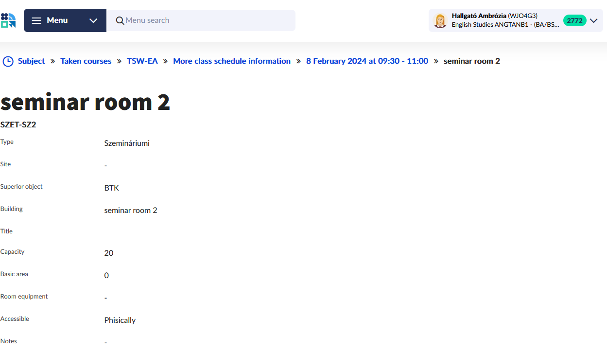 Clicking Details, the data of the time as well as the details of the related rooms can be viewed, such as the name and the address of the building where the room can be found, and accessibility information too.