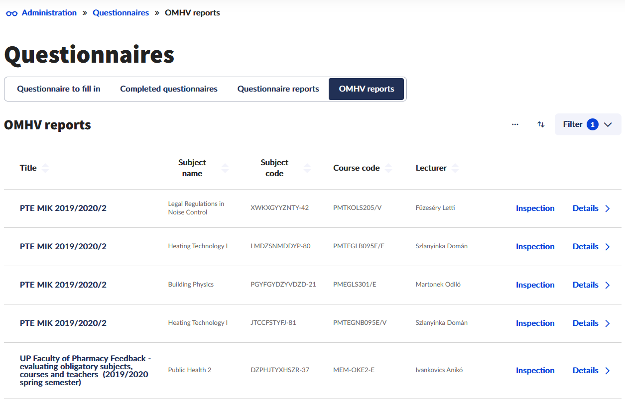 This screen displays the OMHV reports the teachers had published. They include the students' evaluation of the subjects and courses.