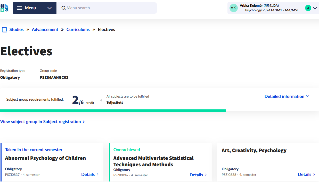 The completed subjects which were registered and completed outside the model curriculum can be viewed by selecting Optional in the window appearing after clicking the Curriculum network link.