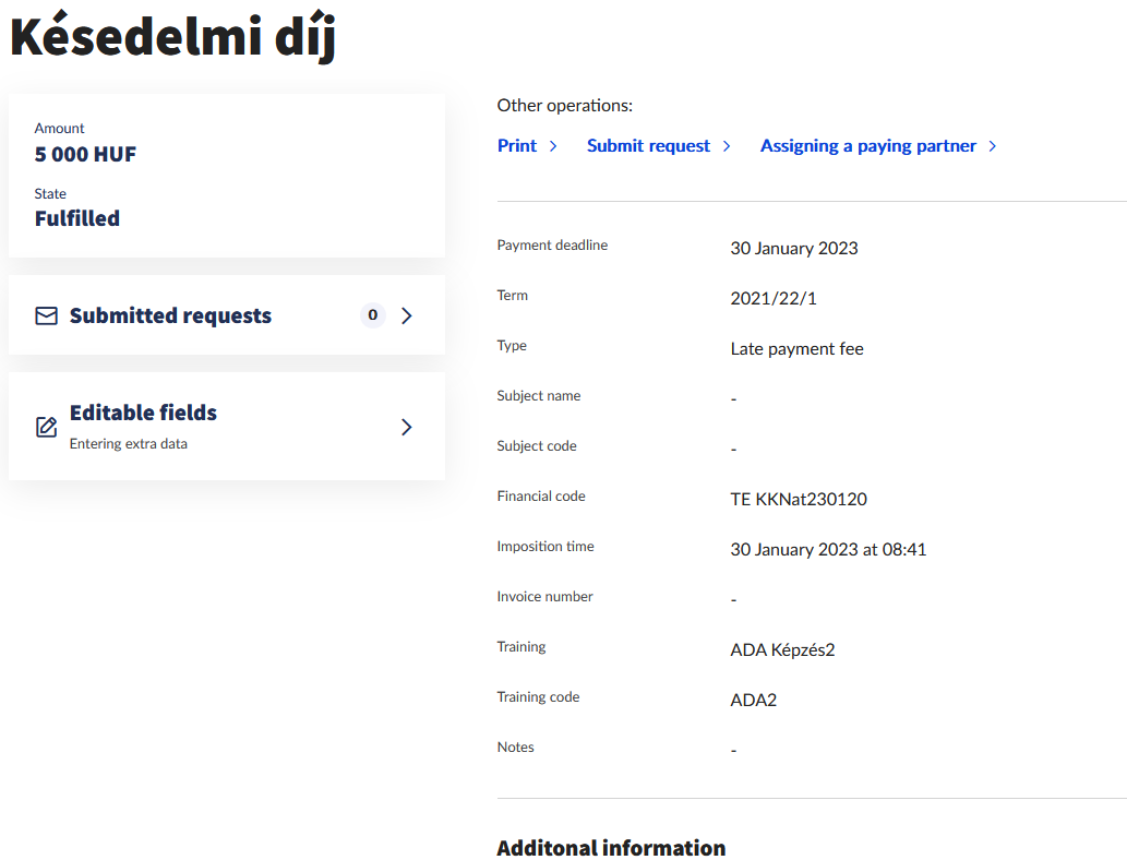 - Submitted requests: The requests related to the item can be viewed by clicking the link. This also covers the case when submitting a fee-based request that entailed the transcription of the administration fee, and also the case when a request is submitted launched from a given item, e.g. request for new invoice, request for instalments.