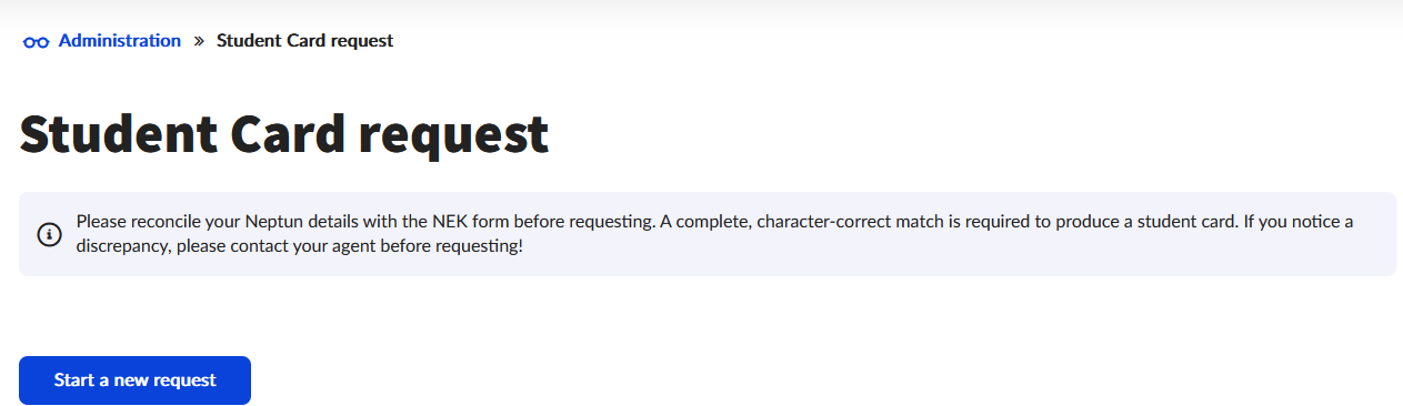 A NEK data sheet from any official document office must be obtained before launching the request. The NEK data sheet contains the personal data, and the Student Card can be produced with exactly these data.
