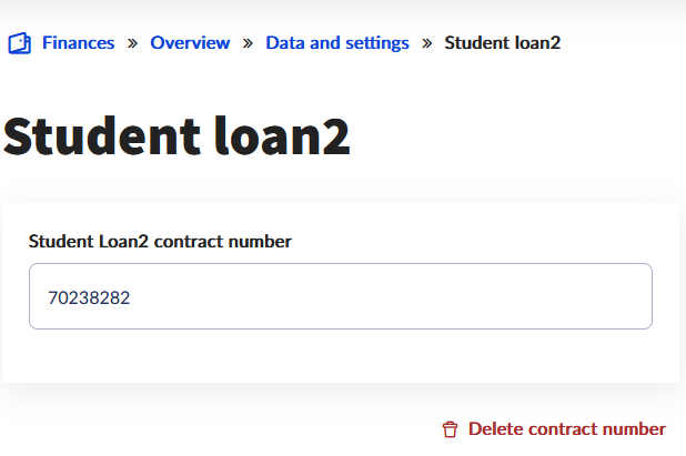 It depends on institutional settings whether the student can record, delete the contract number and whether the Student Loan2 card is available on the Student Web Interface on the Finances/Data and settings screen. A message informs on the screen if the contract number cannot be deleted after recording it.