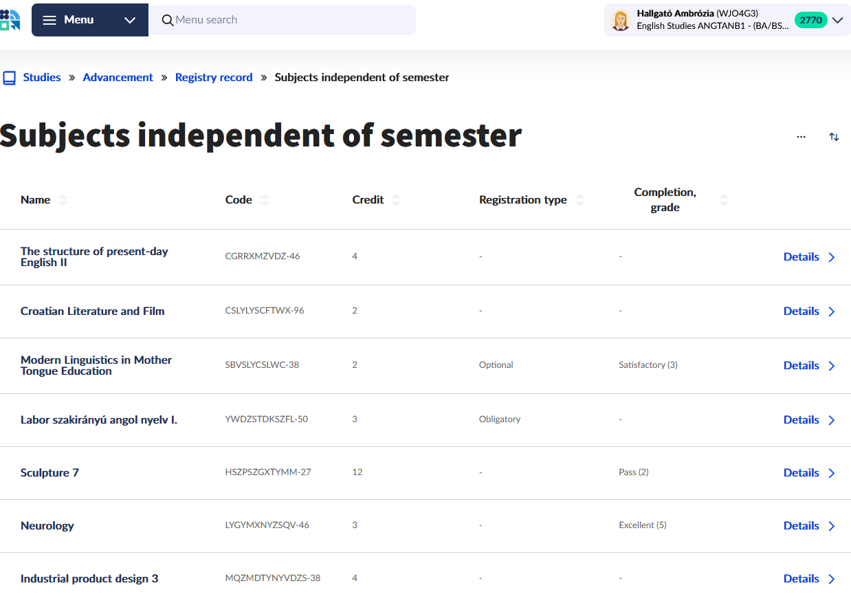 Completions, the institution records seperately from the subjects taken in the the semester, are displayed on this screen. In most cases these are the recognized (accredited) subjects.