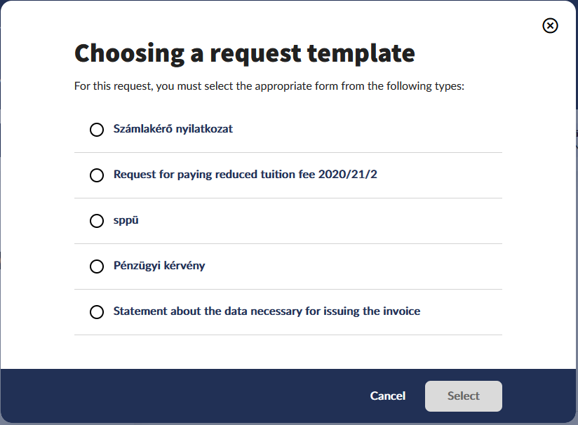 After pressing the button the system offers the request forms that can be filled in for the given item. After selecting the template and clicking the Select button, the student can fill in the request and submit it for administration.