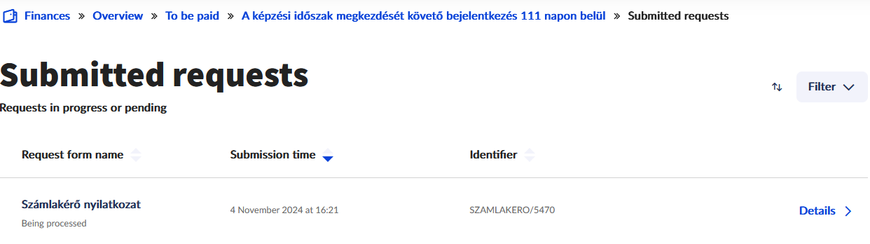 In case of already paid items only the 'Financial request' and 'Request invoice' request forms are displayed by clicking the Submit request link. The 'Instalment payment request', the 'Mitigation request' and the 'Request for modification of payment dealine' request forms are not displayed in the list of requests that can be completed, if the item is already of 'Completed' status.