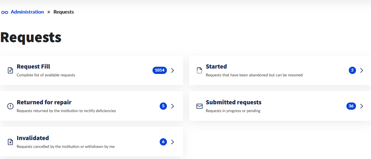 The number of requests is indicated on the Started, Returned for repair, Submitted requests links.