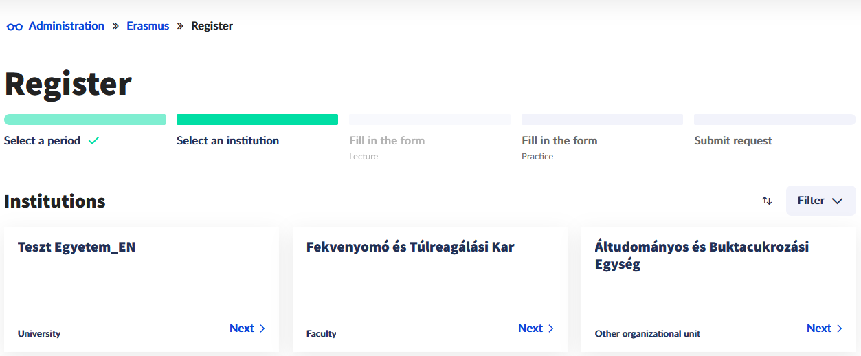 Selecting the application option of Theoretical and practical type, the screen displays the contracts linked to the given period, that is which department concluded a contract of what contents with which foreign organizational unit.