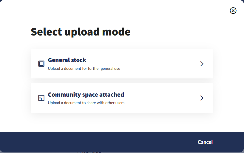 After clicking the button, the 'select upload mode' window appears, where the General stock and Community space attached links can be selected.