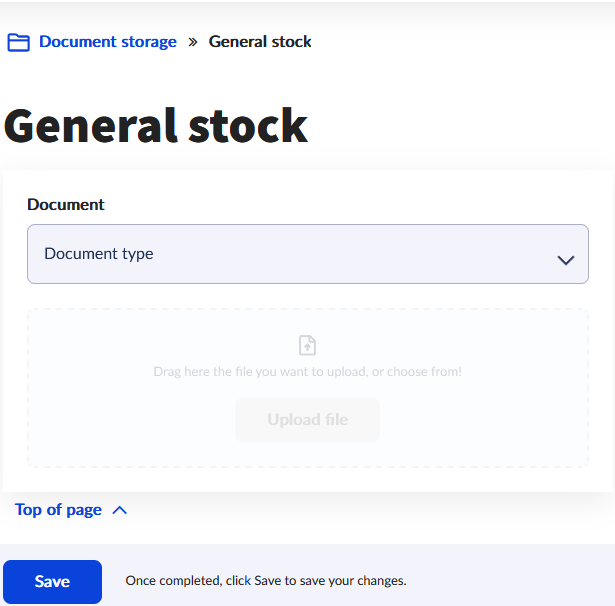 The General stock form is available after clicking the link, where after selecting the Document type and clicking the Upload file button, the required document can be uploaded with the 'drag' function.