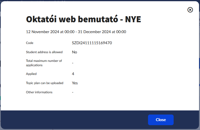 In the Period field of the Thesis topics screen appearing by clicking the Start a request for admission button on the Studies/Degree thesis screen, the valid degree thesis periods can be viewed by clicking the XXX icon.