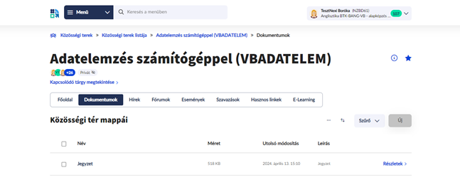 A Dokumentumok lapfülön egy listában megtekinthetők a közösségi tér mappái.