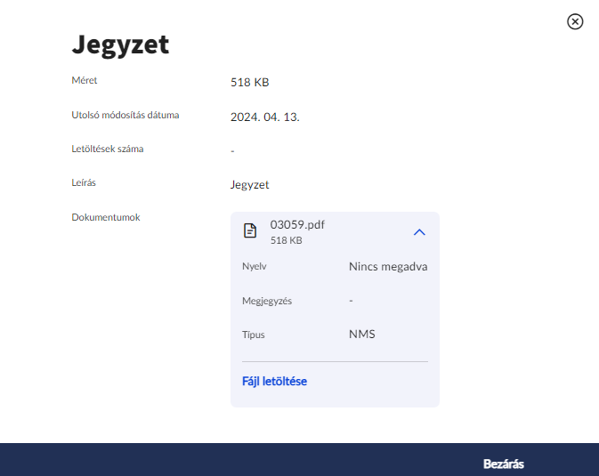 A Dokumentumok mezőben a dokumentum neve melletti nyílra kattintva megjelennek a dokumentum részletei, ahol a Fájl letöltése linkkel lehetőség van a letöltésre.