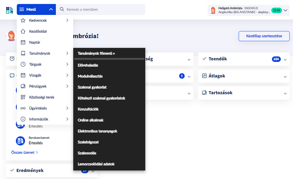Bejelentkezést követően a felület bal felső részéből érhető el a menü. A Menüben lehet megtalálni a különböző, tanulmányokhoz kapcsolódó funkciókat, információkat.