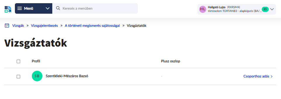 Az egyes felületeken morzsamenü segíti a felhasználót a tájékozódásban. A morzsamenü azt jelenti, hogy minden felületen megmutatjuk, hogy az oldalon belül hol helyezkedik el a felhasználó, milyen elérési úton érhető el az adott felület. Például a Vizsgáztatók felületet a menüből a Vizsgák -> Vizsgajelentkezés -> Vizsga részletei útvonalon érhetjük el. A morzsamenü egyes elemei nem csak a tájékozódást segítik, de linkként is funkcionálnak, így a felhasználó egy lépésben visszatérhet ebben az esetben például a Vizsgajelentkezés felületre.