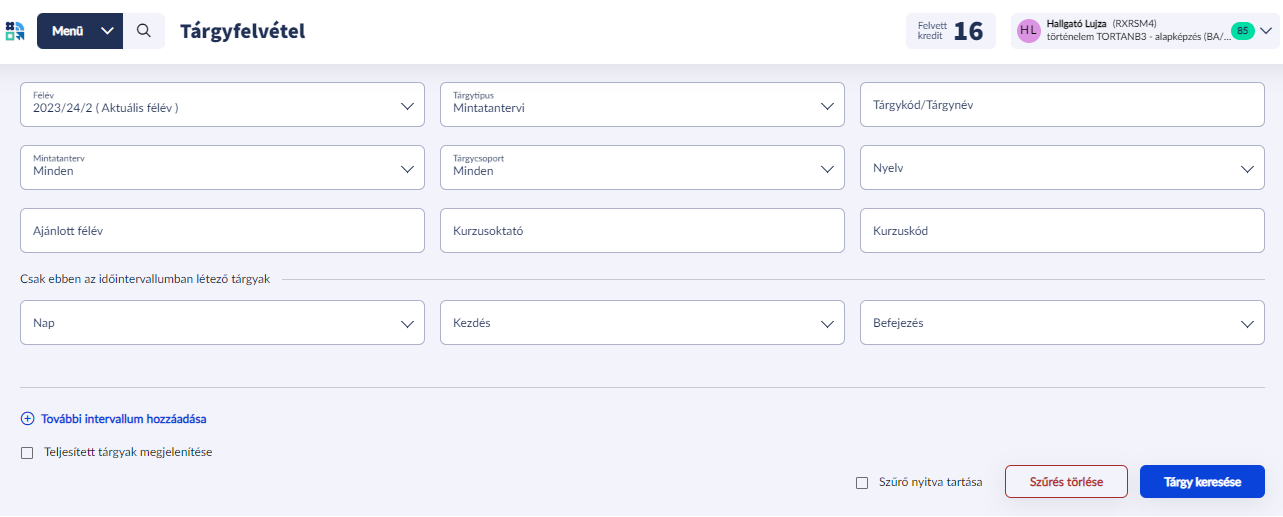 Ha nagy mennyiségű adat található a felületen mindenképpen érdemes használni a szűrőt, például tárgyfelvételkor érdemes lehet a tárgyak listáját ajánlott félévre szűkíteni a könnyebb áttekinthetőség érdekében.
