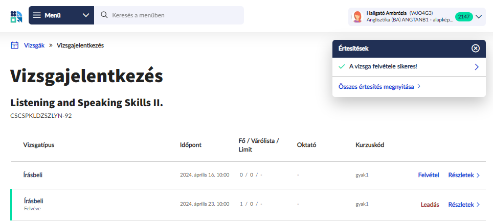 A Neptun hallgatói felületen elvégzett sikeres vagy sikertelen módosításokról értesítés érkezik, ez az értesítés a profilmenü alatt jelenik meg. Jellemzően minden olyan műveletről érkezik visszajelzés, ami valamilyen adatváltozást vagy annak kísérletét jelenti, mint például különböző le- és feljelentkezések, dokumentum feltöltése, adatmódosítás, üzenetküldés stb.