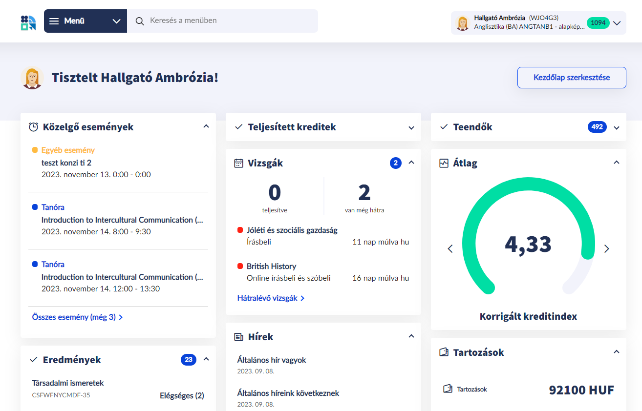 A bejelentkezés utáni teendők elvégzése után egy áttekintő felület, a kezdőlap jelenik meg. A kezdőlap célja, hogy egyszerűen, egy felületen lehessen áttekinteni legfontosabb aktuális információkat és teendőket, mint például közelgő események, vizsgák, tartozások, legutóbbi eredmények, üzenetek.