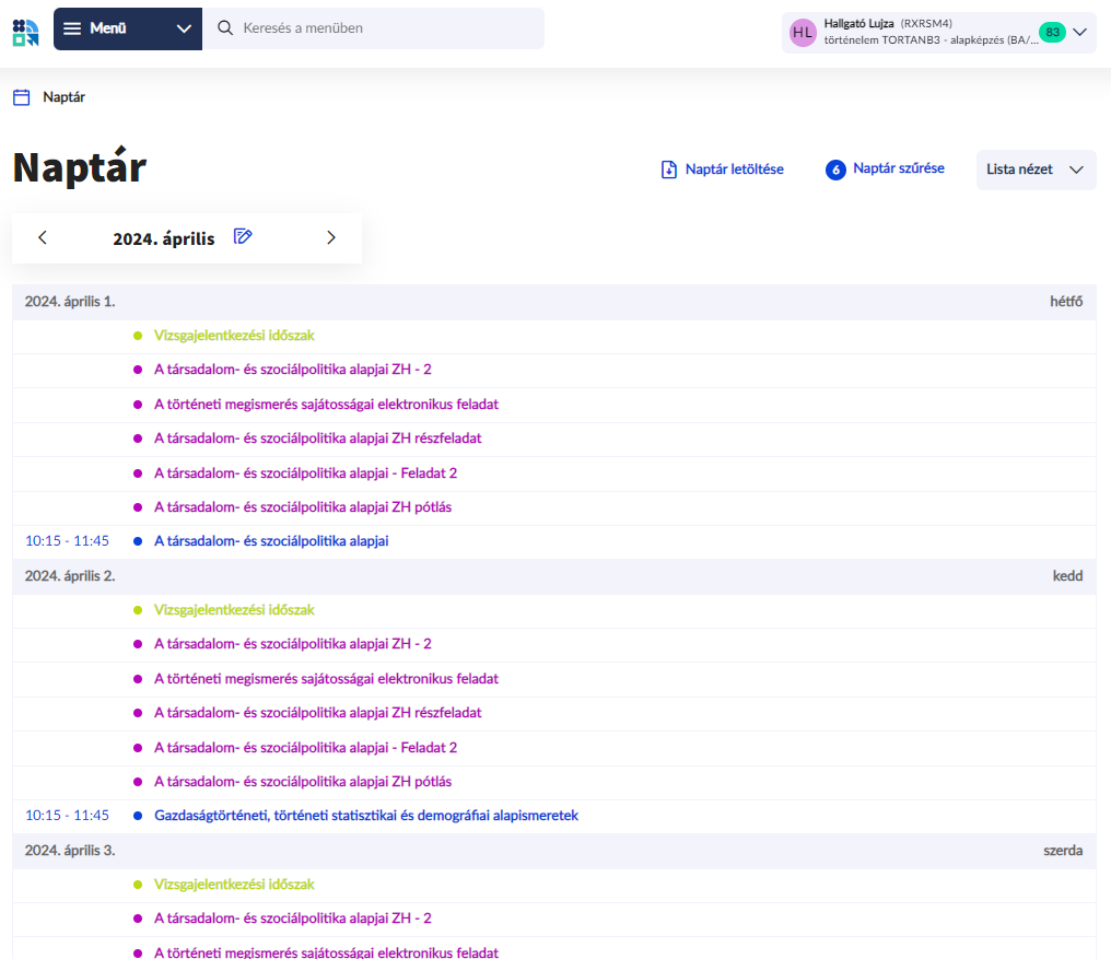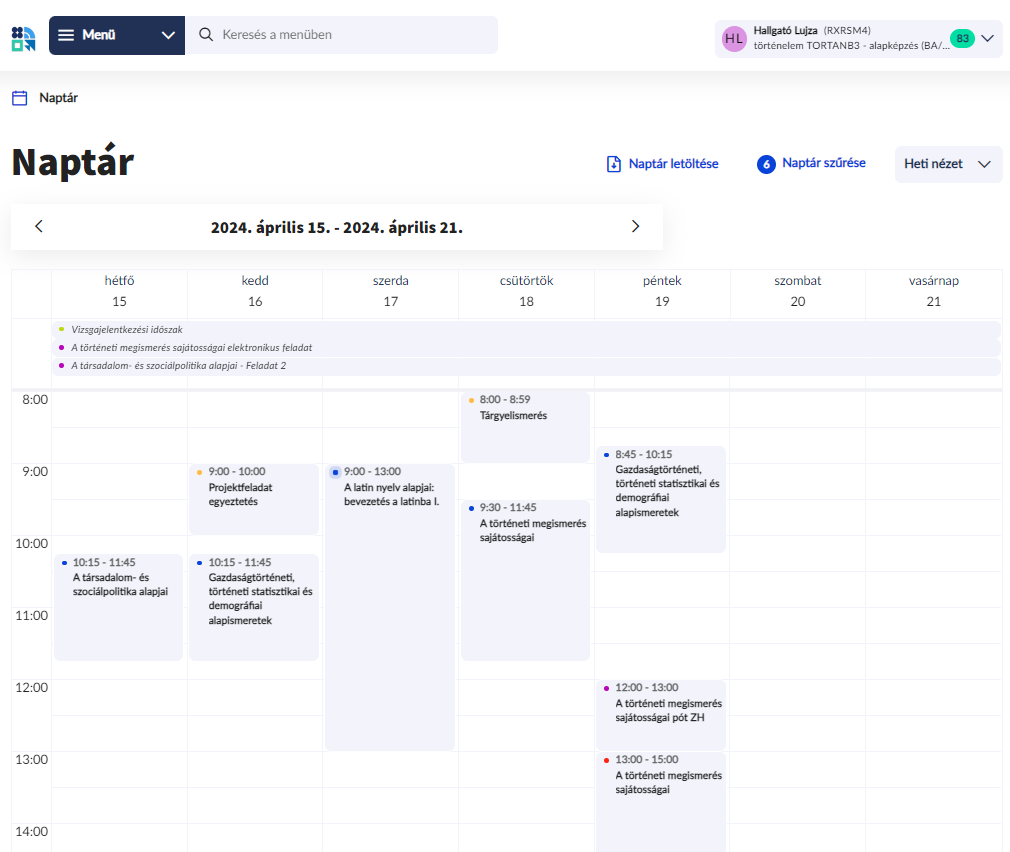 A Naptár szűrése funkcióval kiválasztható milyen típusú események jelenjenek meg a naptárban. Amennyiben intémzényen belül több képzésre is jár a a hallgató, akkor egyszerre több képzéshez kapcsolódó események megjelenítésére is van lehetőség.