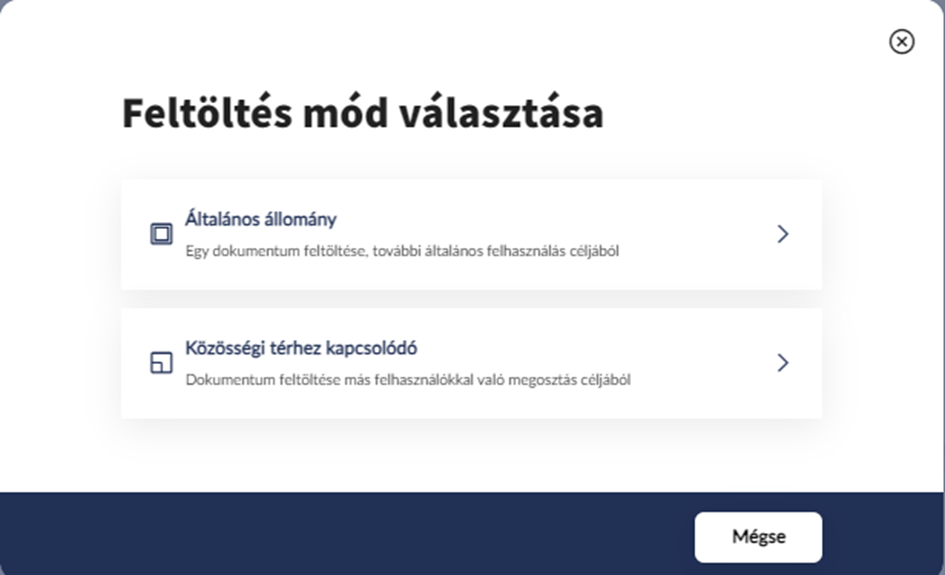 A gombra kattintva a feltöltési mód választó ablak jelenik meg, amelyben az Általános állomány és Közösségi térhez kapcsolódó linkek közül lehet választani.