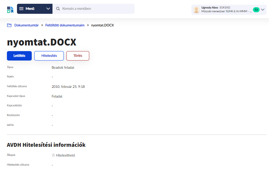 A sorvégi Részletek linkre kattintva láthatók a dokumentum részletes adatai és a dokumentum letölthető és törölhető a felületen.