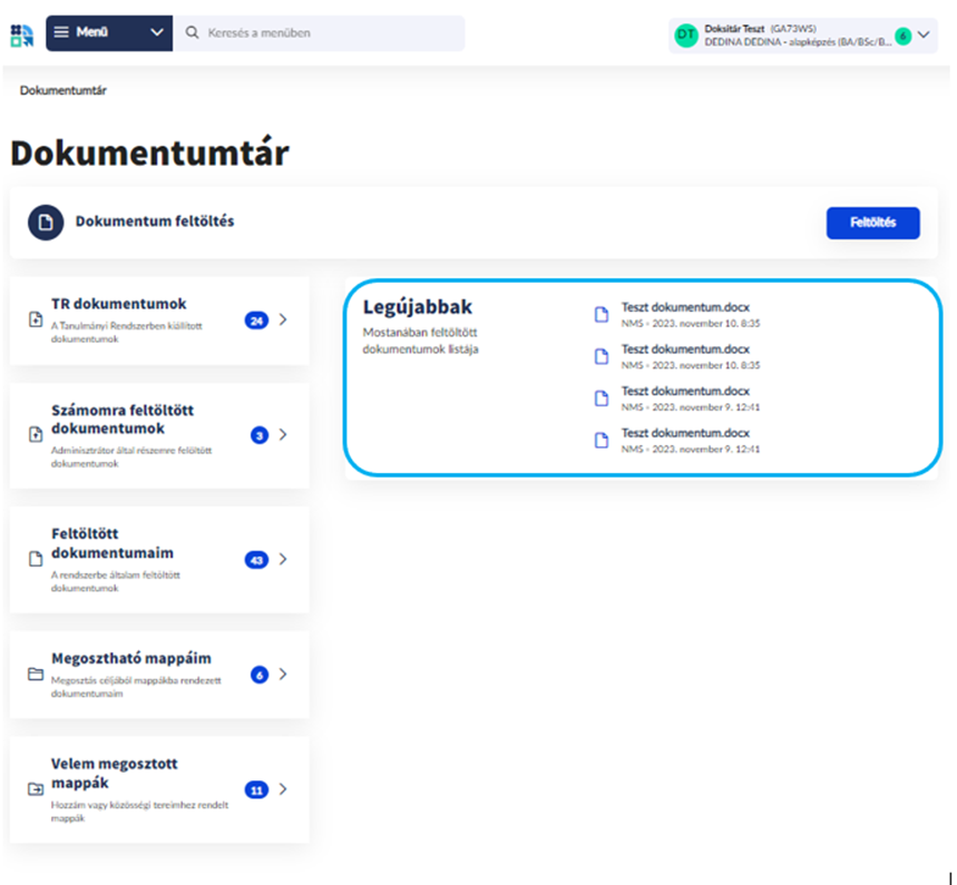 A Felhasználói menü/Dokumentumtár menüpont jobb oldalán a Legújabbak kártyán dátum szerinti utoljára feltöltött dokumentumok kerülnek megjelenítésre az összes dokumentum kategóriát figyelembe véve.