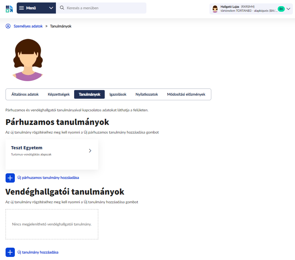 A Felületen lehetőség van az párhuzamos és vendéghallgatói tanulmányok szerkesztésére és hozzáadására.
