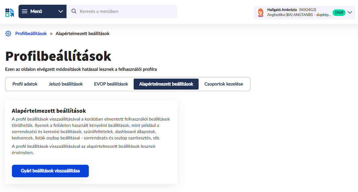A Gyári beállítások visszaállítása gombbal lehetőség van törölni a felhasználói profilba mentett beállításokat, mint például a kezdőlap elrendezése, megjelenő elemek, a különböző felületeken beállított megjelenő oszlopok, sorrendezési beállítások, illetve ahol erre lehetőség van szűrési feltételek. A funkció csak felületi beállításokat töröl, nem töröl a profilhoz köthető mentett adatokat, például jelszót vagy profilképet.