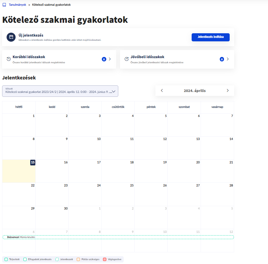Továbbá színezéssel jelölésre kerül, hogy az adott kötelező szakmai gyakorlati jelentkezés milyen státuszú: