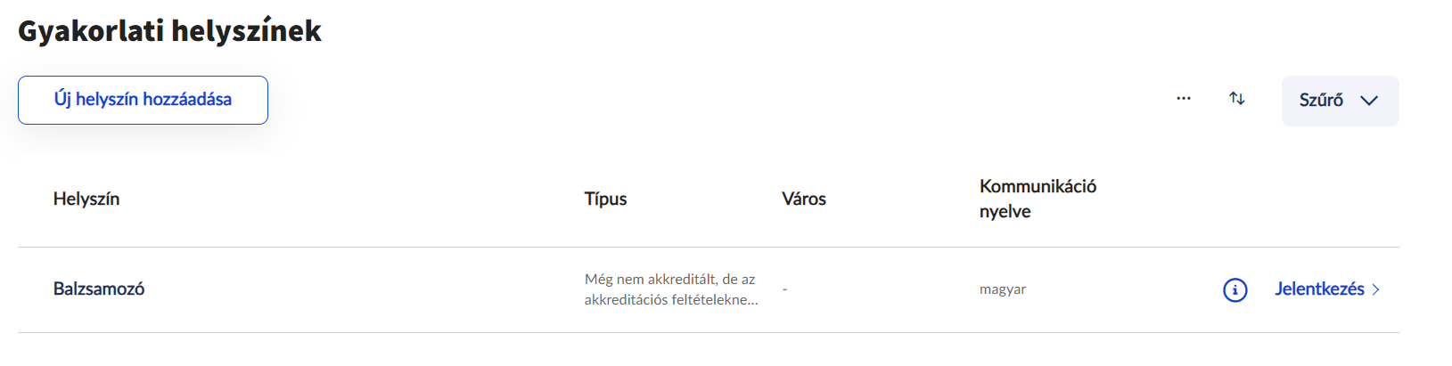 A felvehető gyakorlati helyeknél a sorokban a gyakorlati helyek neve, típusa, városa és a kommunikáció nyelve jelenik meg.