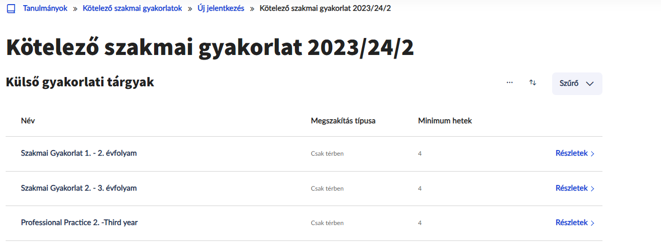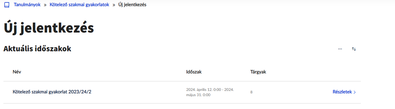 A Részletek lehetőséget választva egy listás felület jelenik meg, ahol az időszakokhoz kapcsolódó külső gyakorlati tárgyak kerülnek megjelenítésre.