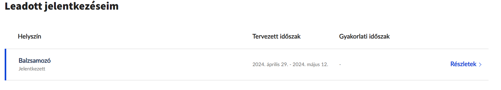 A felületen a helyszín gyakorlati időszakainál található azok az időszak blokkok amelyre a jelentkezést leadhatja.