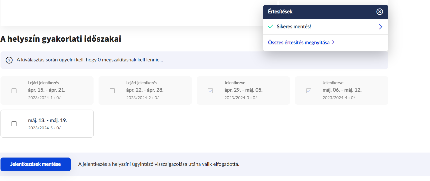 Az időszak blokkok kijelölése után a Jelentkezések mentése gombra kattintva megtörténik a gyakorlati tárgyra való jelentkezés, melynek sikerességéről értesítést küld a program.