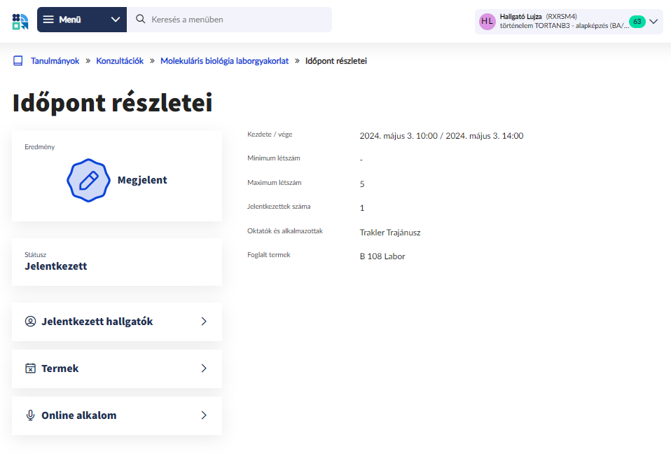 Az időpont részletire kattintva lehet megtekinteni az alábbi információkat: