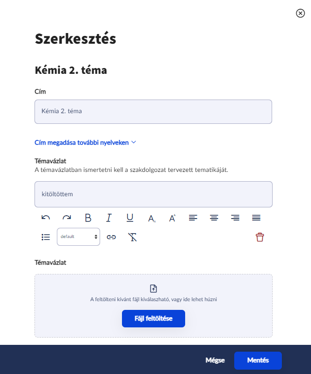 A linkre kattintás után – amennyiben engedélyezésre került – megadható a cím, a témavázlat, illetve a témavázlat feltöltésére is itt van lehetőség a Fájl feltöltése gombra kattintva.