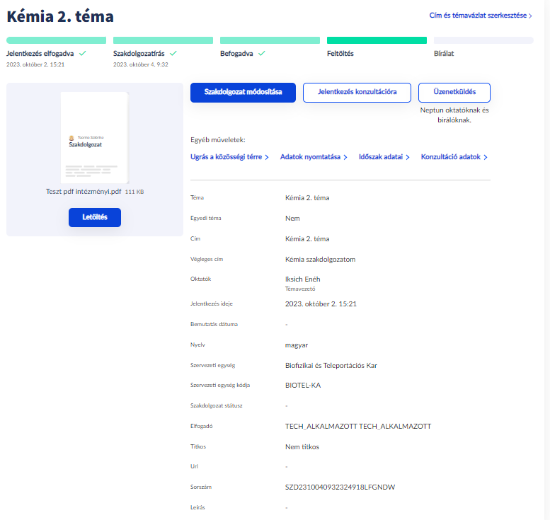 A Szakdolgozathoz kapcsolódó dokumentumok feltöltését követően a szakdolgozat sor Feltöltés állapotban marad addig, ameddig az le nem jár az intézmény által beállított feltöltési határidő, vagy a szakdolgozat elbírálásra nem kerül.