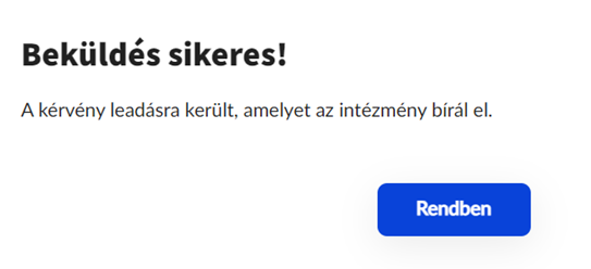 A kérvényben a hallgatónak lehetősége van megadni a szakdolgozat címét, kiválasztani az oktatót, akinél szeretne szakdolgozatot írni, valamint szövegesen megadni a témát. Az adatok ellenőrzését követően a Kérvény beküldése gombra kattintva véglegesíthető a beadás. A beküldés sikerességéről az alábbi visszajelző üzenet tájékoztat: