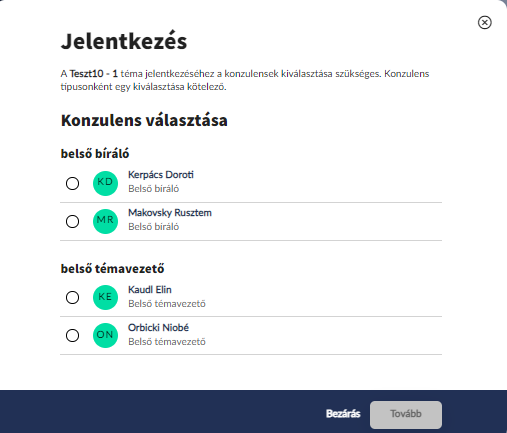Ha az intézményi beállítások lehetővé teszik, akkor a Jelentkezés gombra kattintva megjelenik a Konzulens választása ablak, ahol bíráló típusonként blokkosítva kerülnek megjelenítésre a szakdolgozat témához rendelt választható oktatók. Bíráló típusonként 1 oktatót választható, amely kötelező a továbblépéshez, és az így kiválasztott oktató kerül hozzárendelésre a jelentkezéssel létrejövő témajelentkezés sorhoz.