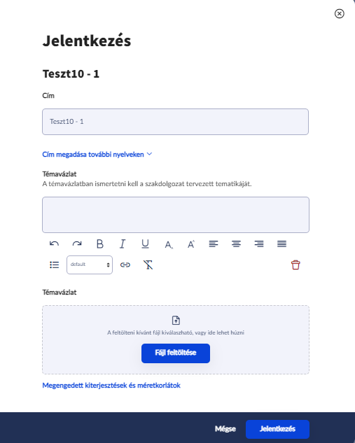 Ha az intézményi beállítások engedélyezik, akkor a Jelentkezés gombra kattintva (ha választható konzulens, akkor a Konzulens választása ablak után) megjelenik a cím és témavázlat megadására szolgáló ablak, ahol a megadható a szakdolgozat címe és a jelentkezéshez témavázlat szöveg, illetve témavázlat fájl csatolható.