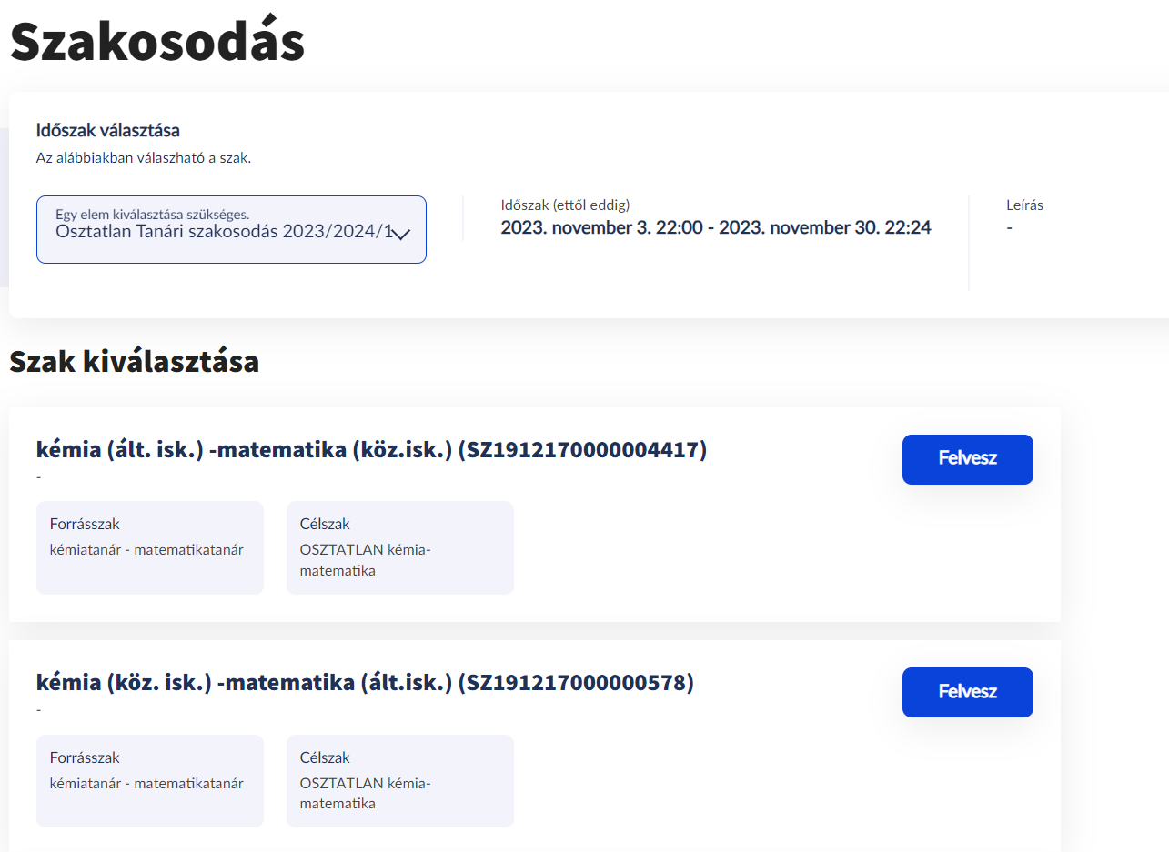 Az időszak kiválasztása után, listázásra kerülnek az időszak keretében meghirdetett szakosodási sorok.