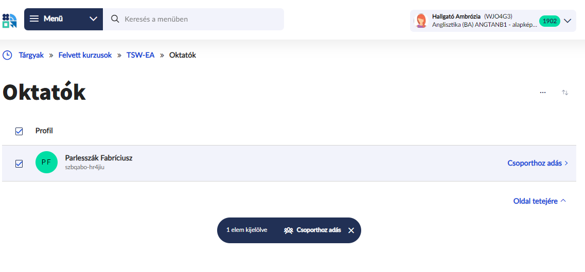 A sorvégi Csoporthoz adás linkre kattintva a listában szereplő oktatókat hozzá lehet adni a felhasználói csoportokhoz.