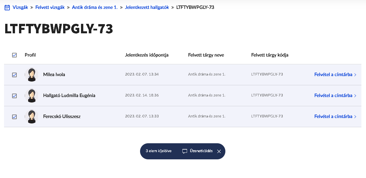 A sor elején található jelölőnégyzetek segítségével kijelölve a hallgatókat, lehetőséget van csoportos üzenetküldésre. A kijelölést követően a lista alatt megjelenő műveletsávban kattints az Üzenetküldés lehetőségre.