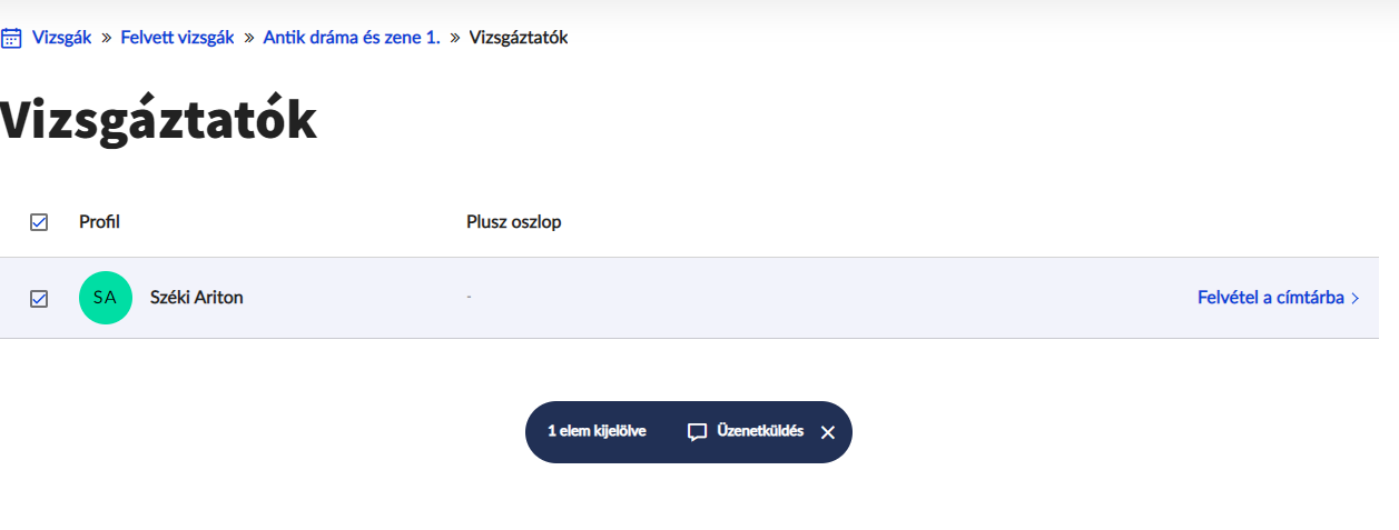A sor elején található jelölőnégyzetek segítségével kijelölve az oktatókat, lehetőséged van csoportos üzenetküldésre. A kijelölést követően a lista alatt megjelenő műveletsávban kattints az Üzenetküldés lehetőségre.