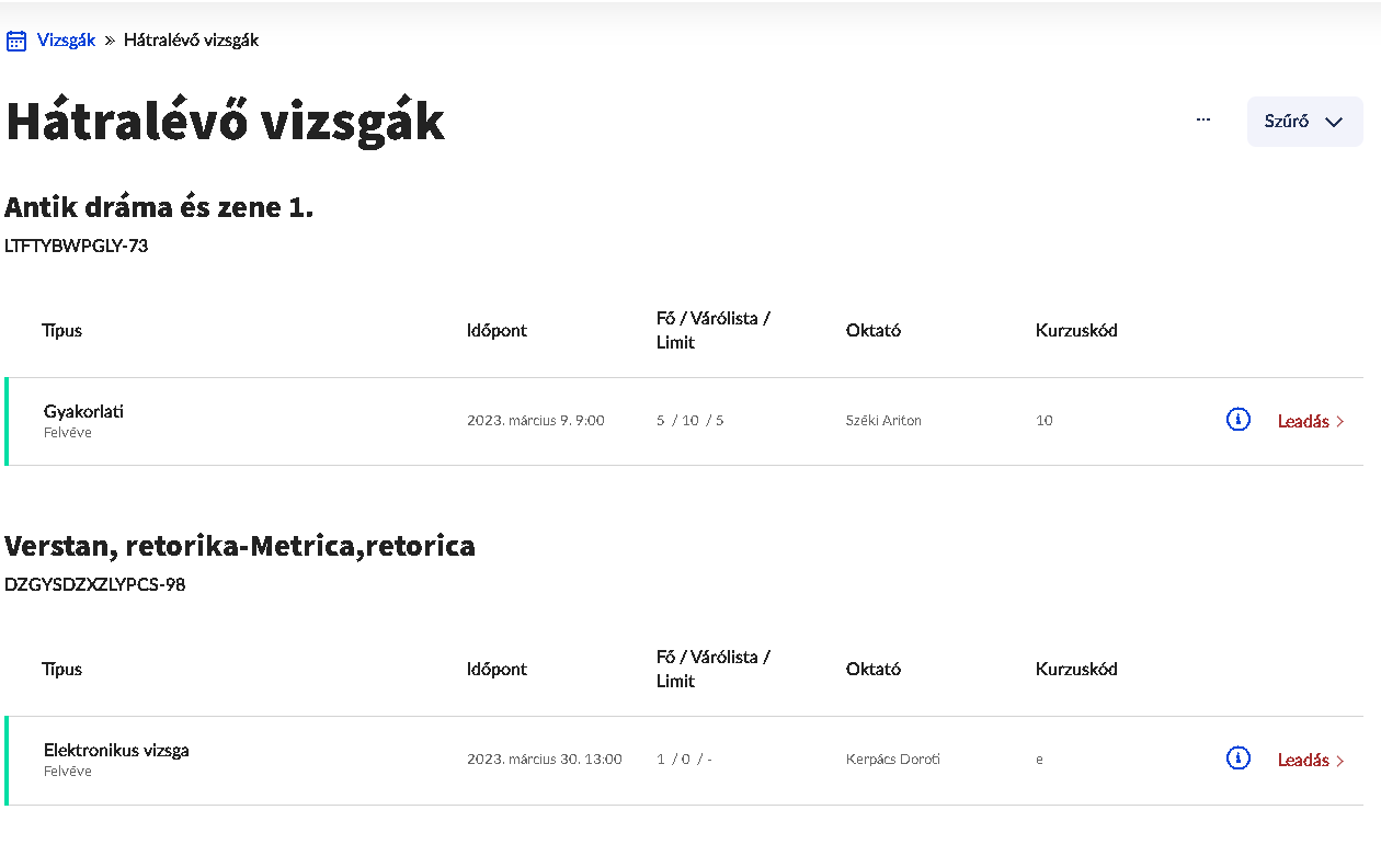 A vizsga áttekintő felületen a Hátralévő vizsgák linkre, vagy közvetlenül a menüben a Vizsgák/Hátralévő vizsgák menüpontra kattintva tárgyanként listázva tekintheted meg azokat a jövőbeli vizsgákat amelyekre jelentkeztél. A megjelenített adatok tekintetében a felület megegyezik a vizsgajelentkezés felülettel.