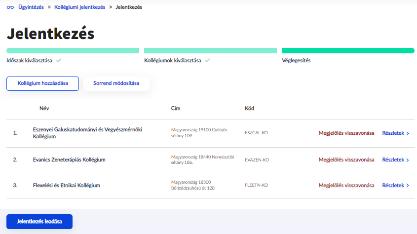 Ha már véglegesnek tekinthető a kiválasztott kollégiumok listája és sorrendje, a Jelentkezés leadása gombbal menthető a jelentkezés.